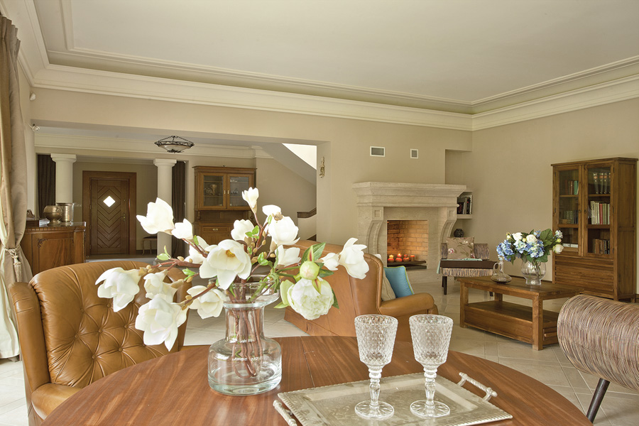 Beże i brązy, solidne dębowe meble i obraz z zabytkowym sportowym samochodem. Klasyka w najlepszym stylu.