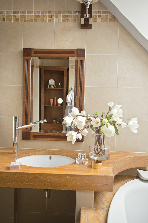 Beże i brązy, solidne dębowe meble i obraz z zabytkowym sportowym samochodem. Klasyka w najlepszym stylu.