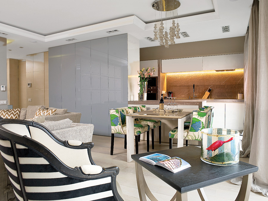 Chłodny kamień i fronty na wysoki połysk ocieplaja krzesła obite lnem marki Christopher Farr.