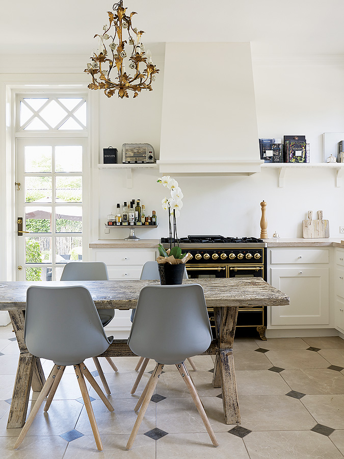 Miks stylu nowoczesnego z rustykalnym. Stół ze starych chińskich drzwi. Nad nim francuski żyrandol, do