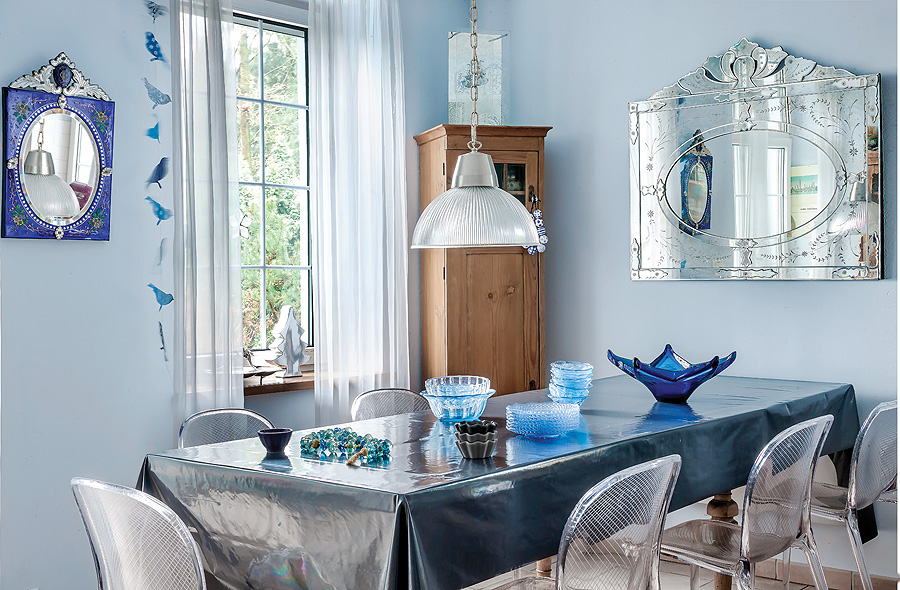 Całe wnętrze powstało z myślą o kolekcji niebieskich filiżanek i deseczek z wzorem cebulowym.