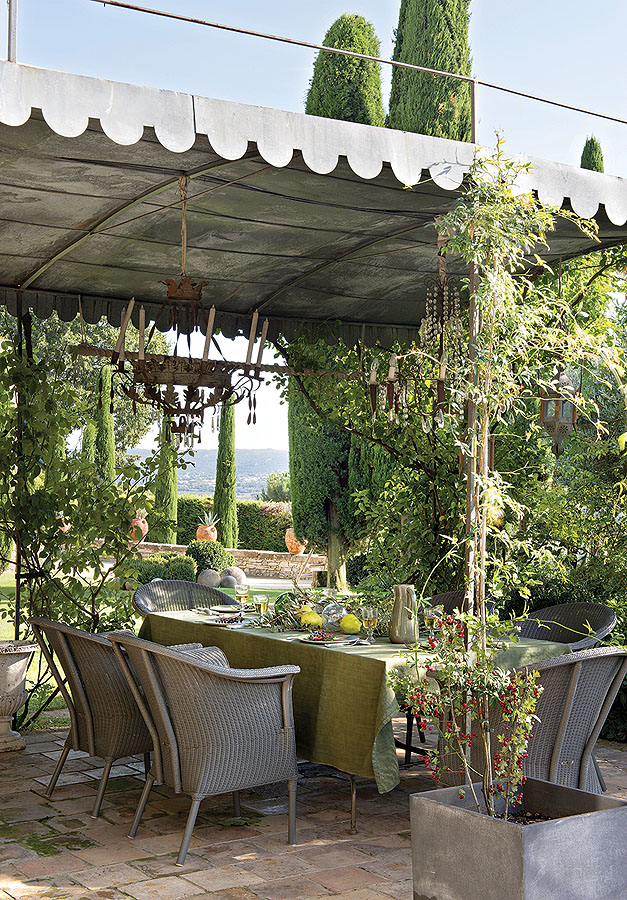 Obowiązkowo: taras w stylu typowo prowansalskim. Pod markizą mosiężny żyrandol i chińskie lampiony.