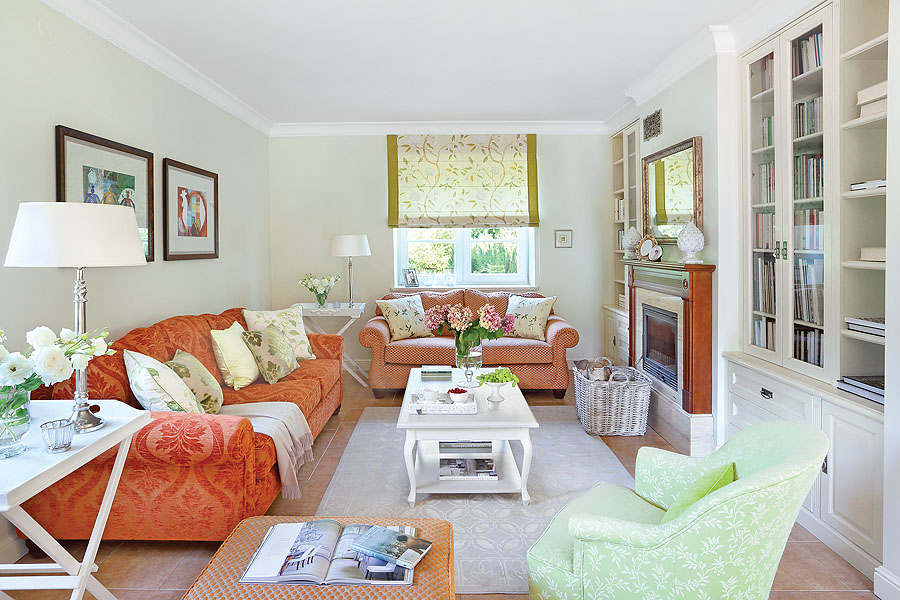 Mięsiste, drukowane lny z roślinnymi motywami (na zasłonach, roletach i poduszkach) zestawiono z szenilowym obiciem sof.