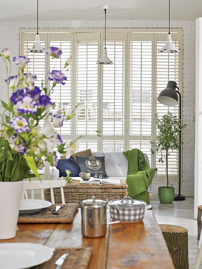 Dominującą biel przełamują delikatne zielenie oraz kolory dekoracji - także sezonowych kwiatów w wazonie.
