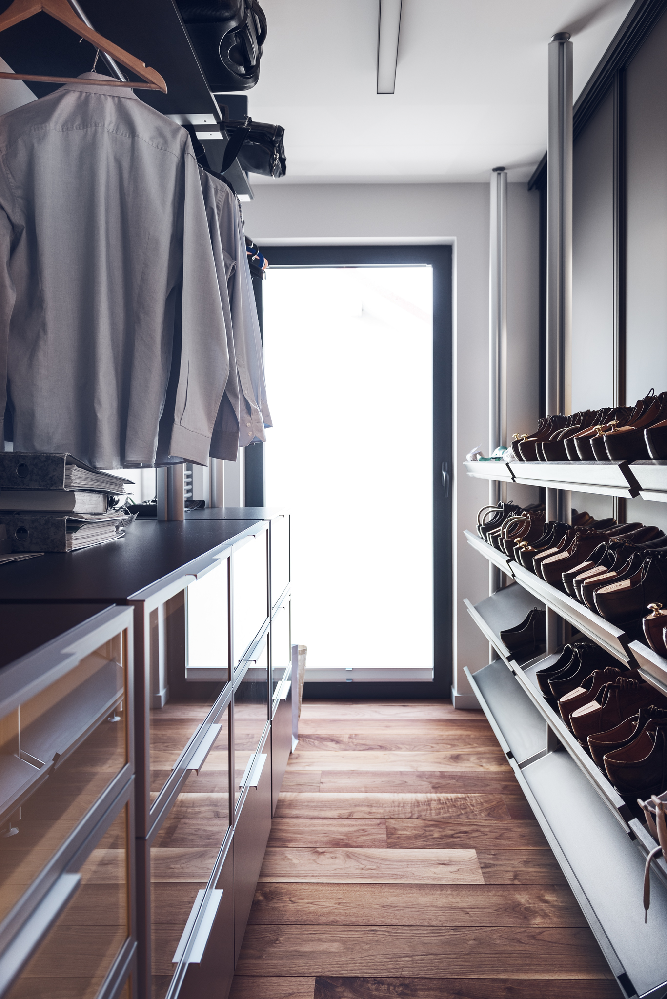 Obszerna i dodatkowo doświetlona lukserami garderoba.