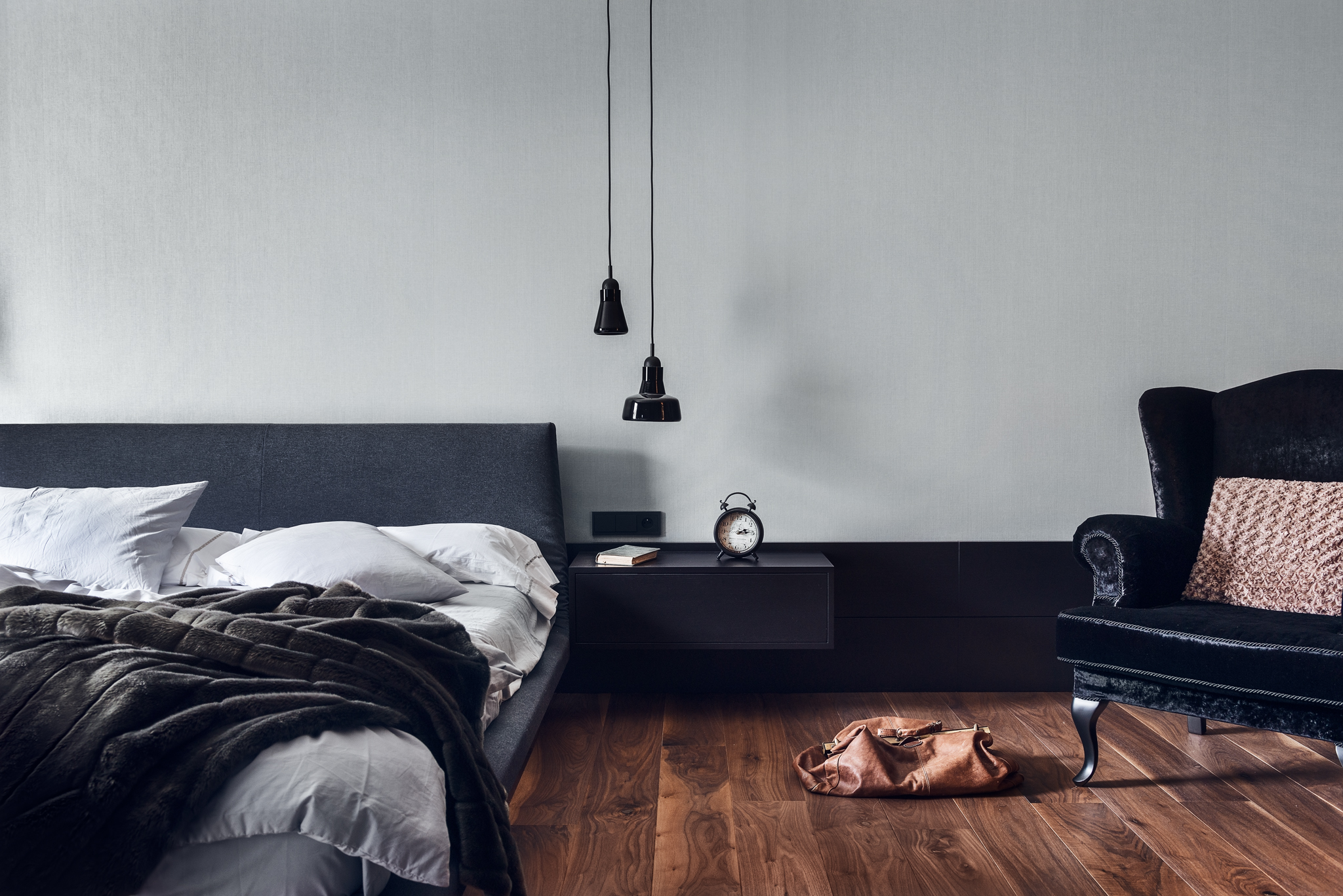 Sypialnia urządzona jest minimalistycznie. Nowoczesny charakter podkreślają wiszące na długich kablach lampy, spełniające