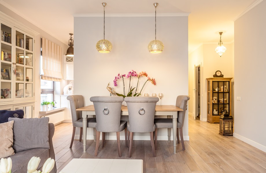 Aranżacja mieszkania nawiązuje do stylu prowansalskiego, ale niedosłownie. W salonie połączonym z jadalnią stylizowane krzesła i orientalne lampy. Wąska kuchnia tonie w bieli i kwiatach. W Warszawie panuje pośpiech, ale w mieszkaniu przy ulicy Bartyckiej czas zwalnia, w powietrzu czuć lekki powiew Prowansji.   Mieszkanie bez kontrastów: ciepło i przytulnie   Na pytanie, jaki charakter ma mieć wnętrze, pan Cezary odpowiada, że żona lubi ciepłe, przytulne