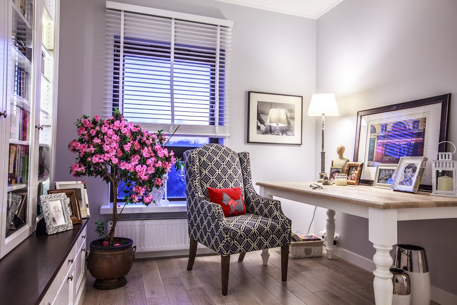 Gabinet urządzony jest w jasnych kolorach, które zestawione są z intensywnym kolorem poduszki i oryginalnym wzorem fotela.
