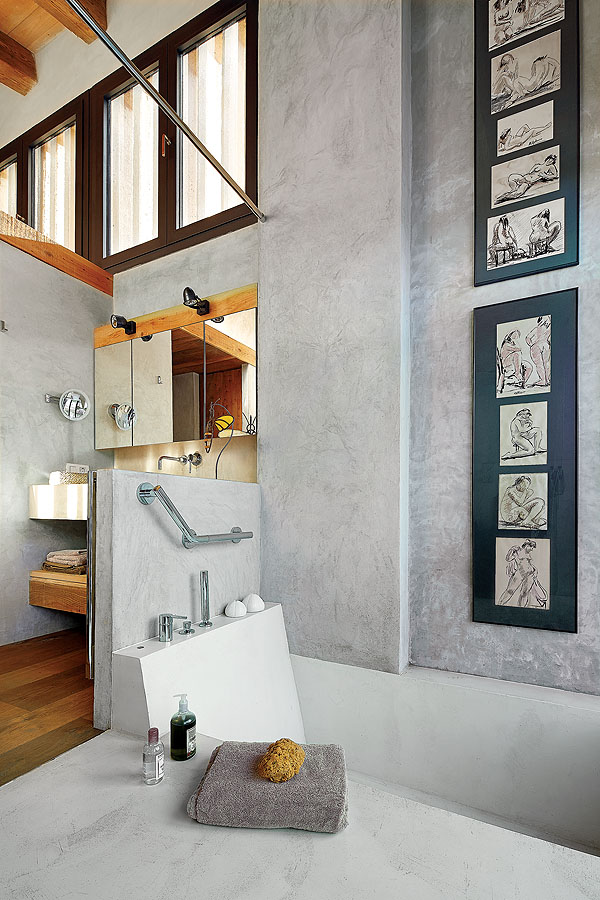 Nawet w łazience na ścianie wisi sztuka: do betonowych ścian pasują grafiki oprawione w antyramę.