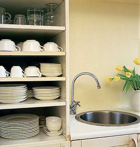 Poukładane naczynia wydają się być częścią dekoracji.