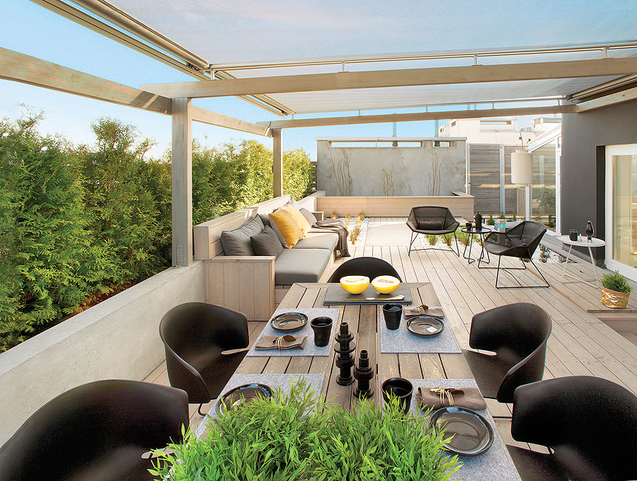 Dwustumetrowy penthouse otacza 120-metrowy taras. Ma dwie główne strefy: jadalnię al fresco przy grillu i salon wypoczynkowy z ogromną, wyłożoną poduchami sofą, wygodnymi pufami i fotelami.
