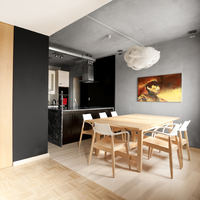 70-metrowe mieszkanie urządzone jest nowocześnie, dizajnersko i minimalistycznie - co sprawia, że wydaje się znacznie większe. Mimo surowego betonu, który dominuje w mieszkaniu, architektom odpowiadającym za wystrój wnętrza udało się stworzyć nie tylko przytulny i prywatny klimat, ale także maksymalnie funcjonalnie wykorzystać przestrzeń.   Nowoczesna aranżacja   Dla właścicieli mieszkania najważniejsza przy aranżacji była przestrzeń i elastyczne r