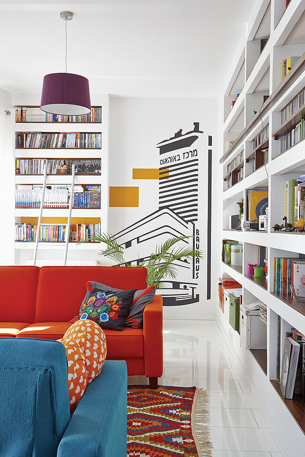 Dwie ściany zostały zaaranżowane na wielkie regały na książki.