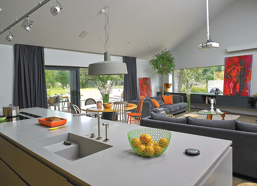 Ogromna wyspa z wygodnym corianowym blatem to najważniejsze miejsce w domu