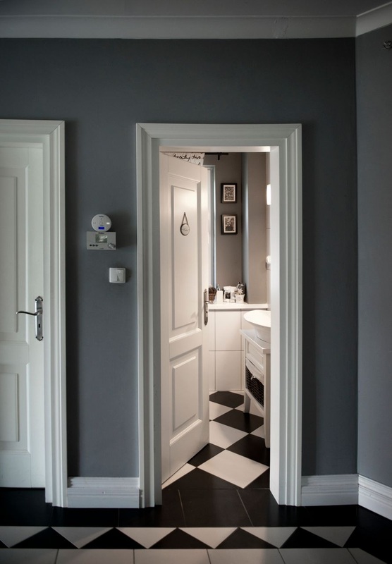 Dom urządzony jest w stylu skandynawskim: dominują szarości, biele oraz piękna podłoga w szachownicę.