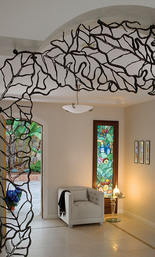 Okna zdobią witraże. Śródziemnomorski dom na niepogodę
