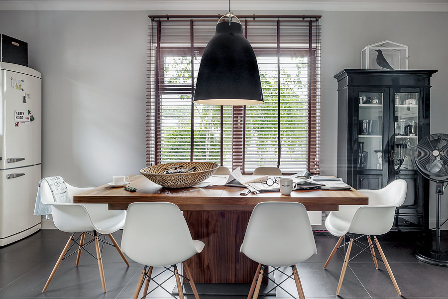 Rozsuwany stół marki Calligaris oraz krzesła Eamesów.