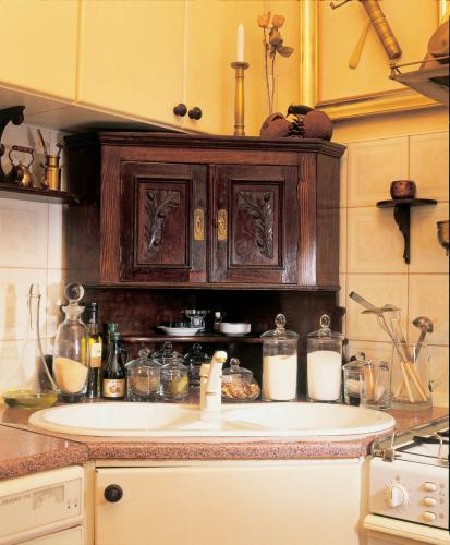 Drewniana zdobiona szafka kuchenna. Dworek jak malowany