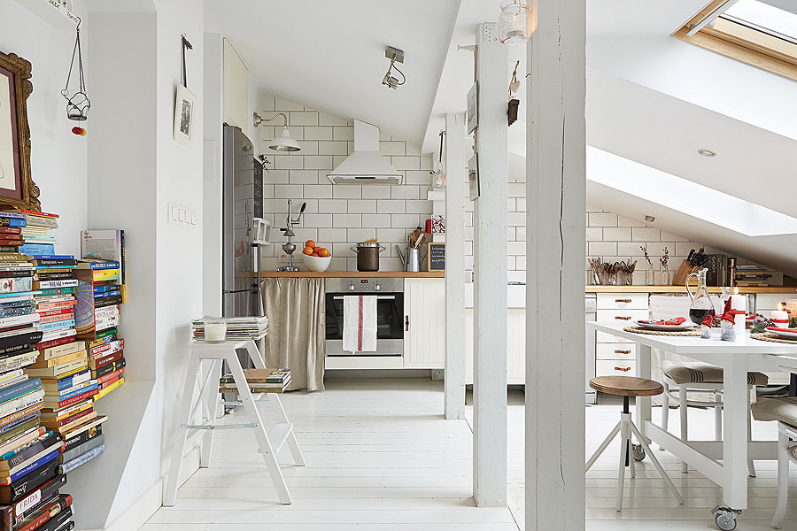 Białe mieszkanie na strychu urządzone w stylu skandynawskim.