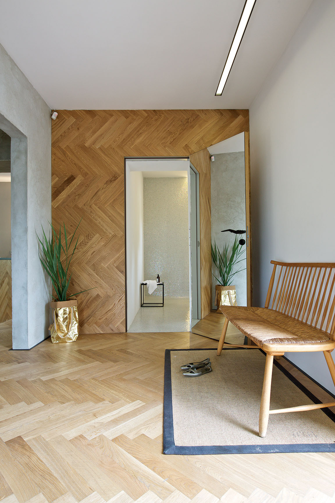 Parkiet na ścianie, światło ukryte w szczelinach, konsola z gazet, drzwi ledwie maźnięte farbą... U Dominiki nie można się nudzić!