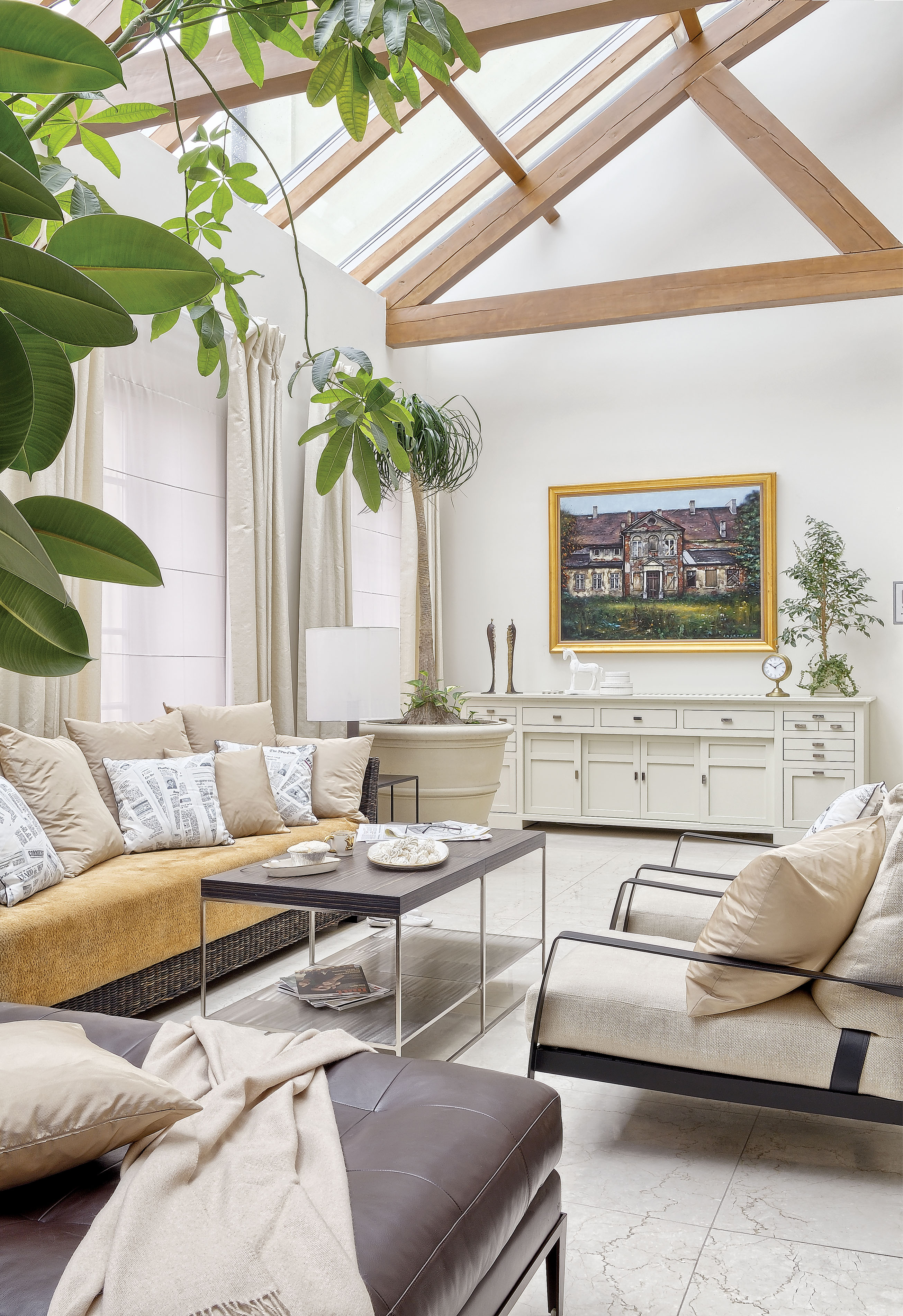 Prawie setka okien z prawdziwymi drewnianymi szprosami, dwa kilometry tkanin na zasłony, setka lamp i żyrandoli. Prawdziwy pałac, a jednak przytulny i kameralny.   Popijamy cappuccino w oranżerii Gdyby nie typowo polska wiosenna pogoda, można by mieć wrażenie, że siedzimy w najprawdziwszym palazzo. Za oknem platany i krzewy różane otoczone bukszpanami. Wokół współczesna klasyka, czyli głównie włoszczyzna: Minotti, Gervasoni, Zanotta. Nie gryzie się z tą p