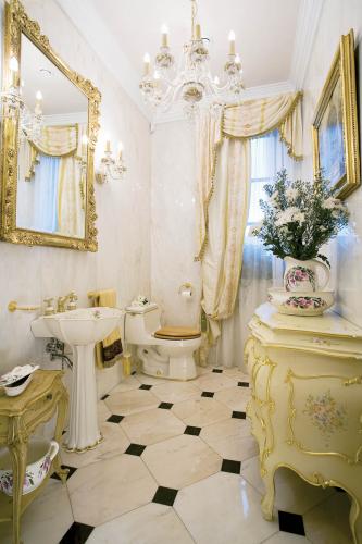 Ręcznie malowane i złocone umywalka i toaleta przywiezione z Ameryki Północnej.
