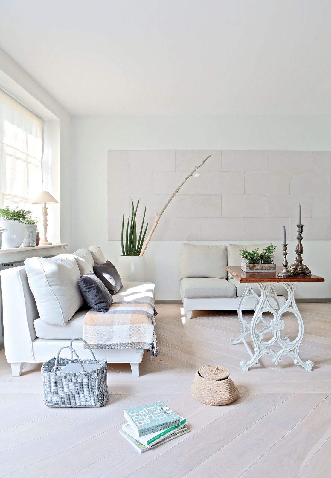 Skandynawskie kolory: rozbielona podłoga, ciepły piaskowiec na ścianie i lekko szare obicia kanap. Do tego