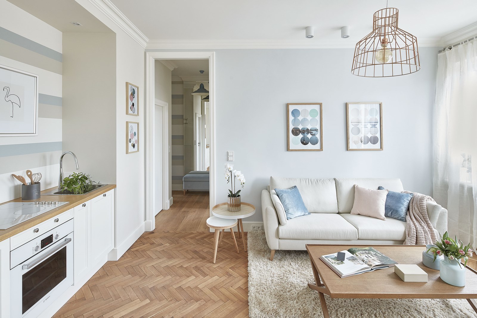Jak przytulnie urządzić 36 metrów kwadratowych? Trochę po skandynawsku, trochę po francusku, z dużą ilością błękitów i bieli. Od razu widać, że to kobieca kawalerka!