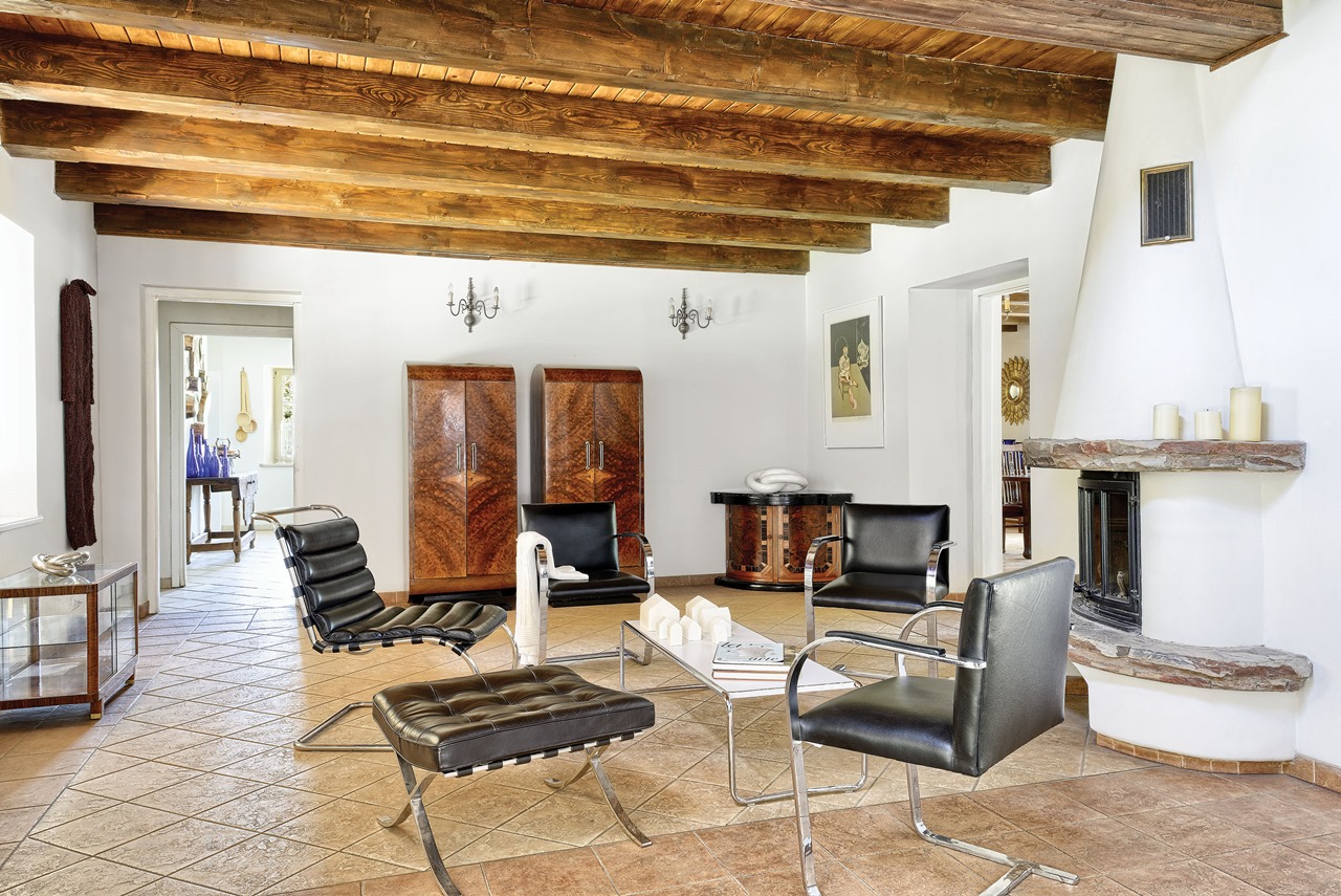 Meksykańsko-polską mieszankę mebli uzupełniają klasyki designu, np. stołek Barcelona zaprojektowany przez Miesa van der Rohe