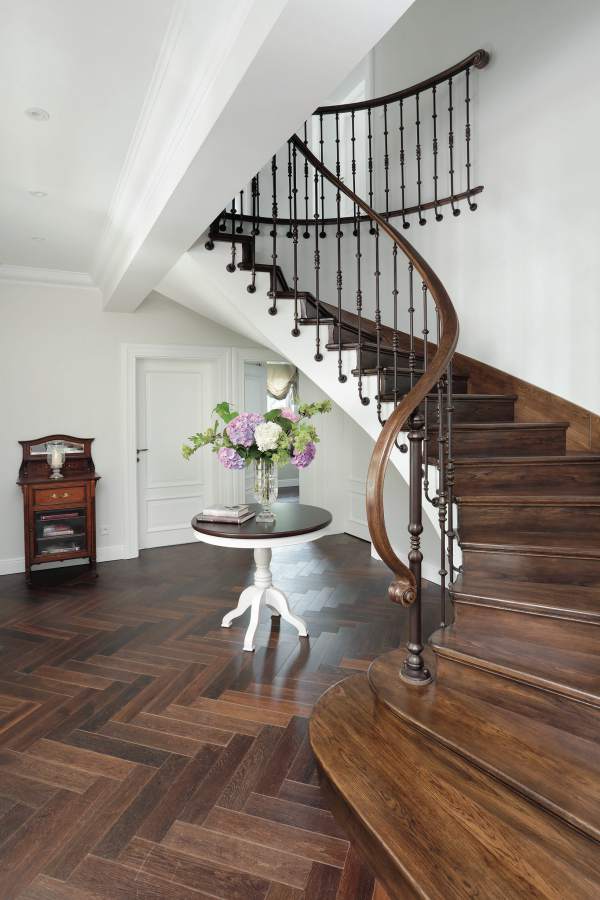 Balustrada kuta – Szymon Gruszka Kowalstwo artystyczne. Elementy drewniane, stopnie oraz pochwyt to dzieło Zbigniewa