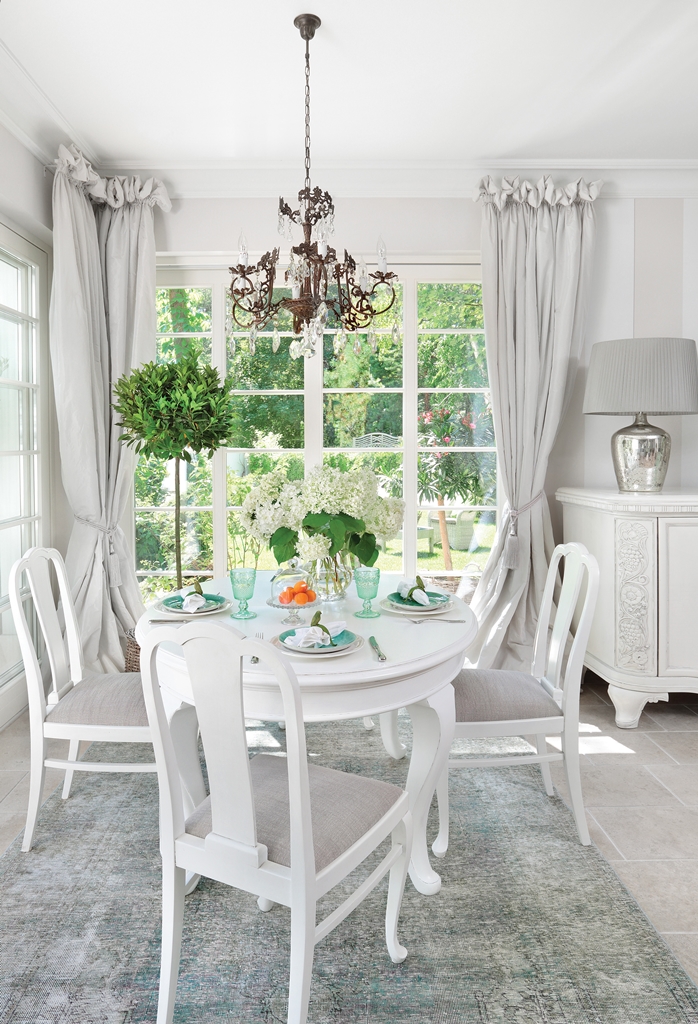 Dębowy, pomalowany na biało stół to pamiątka po babci Stasi. Francuskie szkło i zielona zastawa są ze sklepu LP,