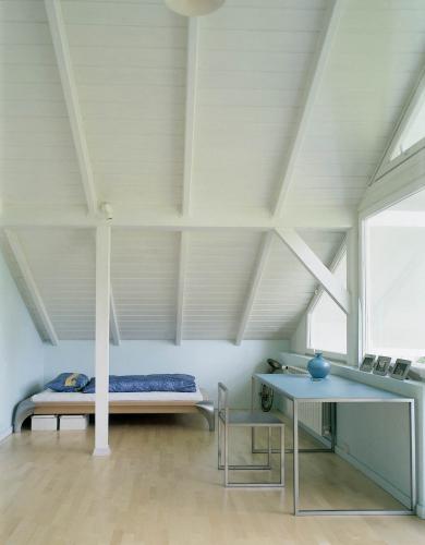 Sypialnia znajduje się na poddaszu. Dom w bieli i błękicie