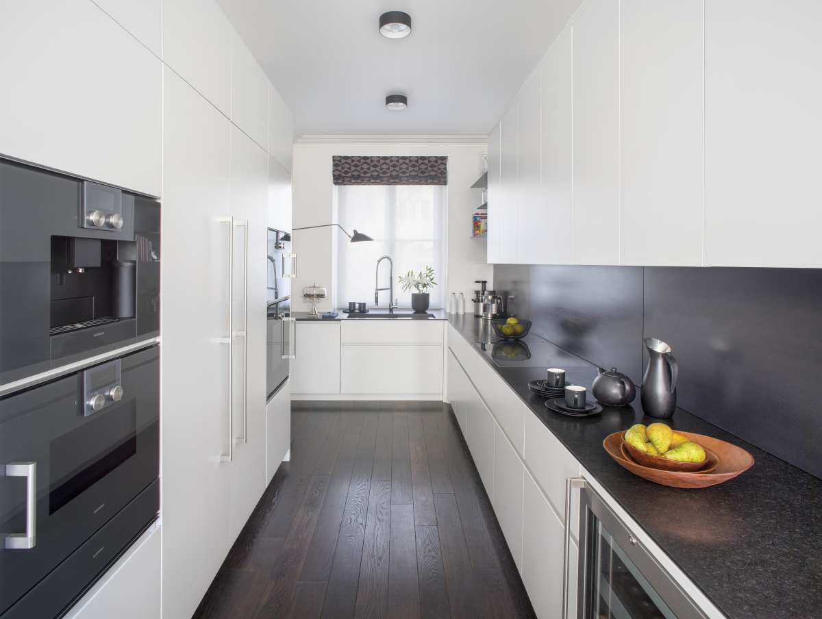 Wyposażenie wnętrza kuchni: podłogi zrobione są z wędzonego dębu, blaty z granitu, a ściany wyłożono