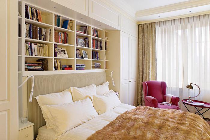 Duże łóżko, a nad nim regał wypełniony książkami.