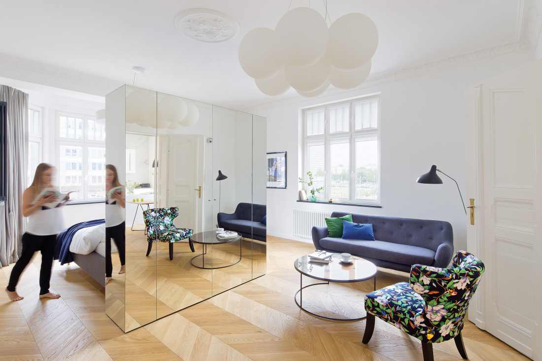 Szafa, która oddziela część sypialnianą od salonu, to bardzo praktyczny mebel – lustro, ściana i regał.
