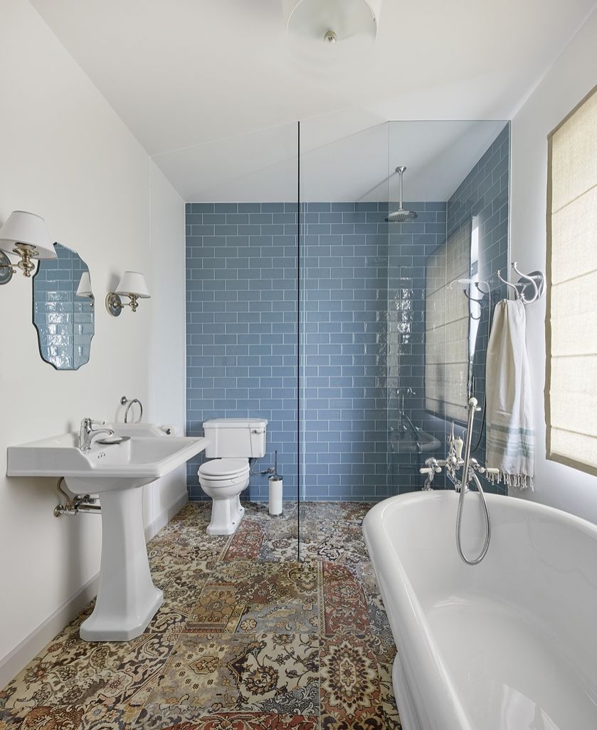 Ciekawy kontrast: dekoracyjne, ręcznie robione płytki podłogowe z ceramiką ścienną ułożoną w cegiełkę.
