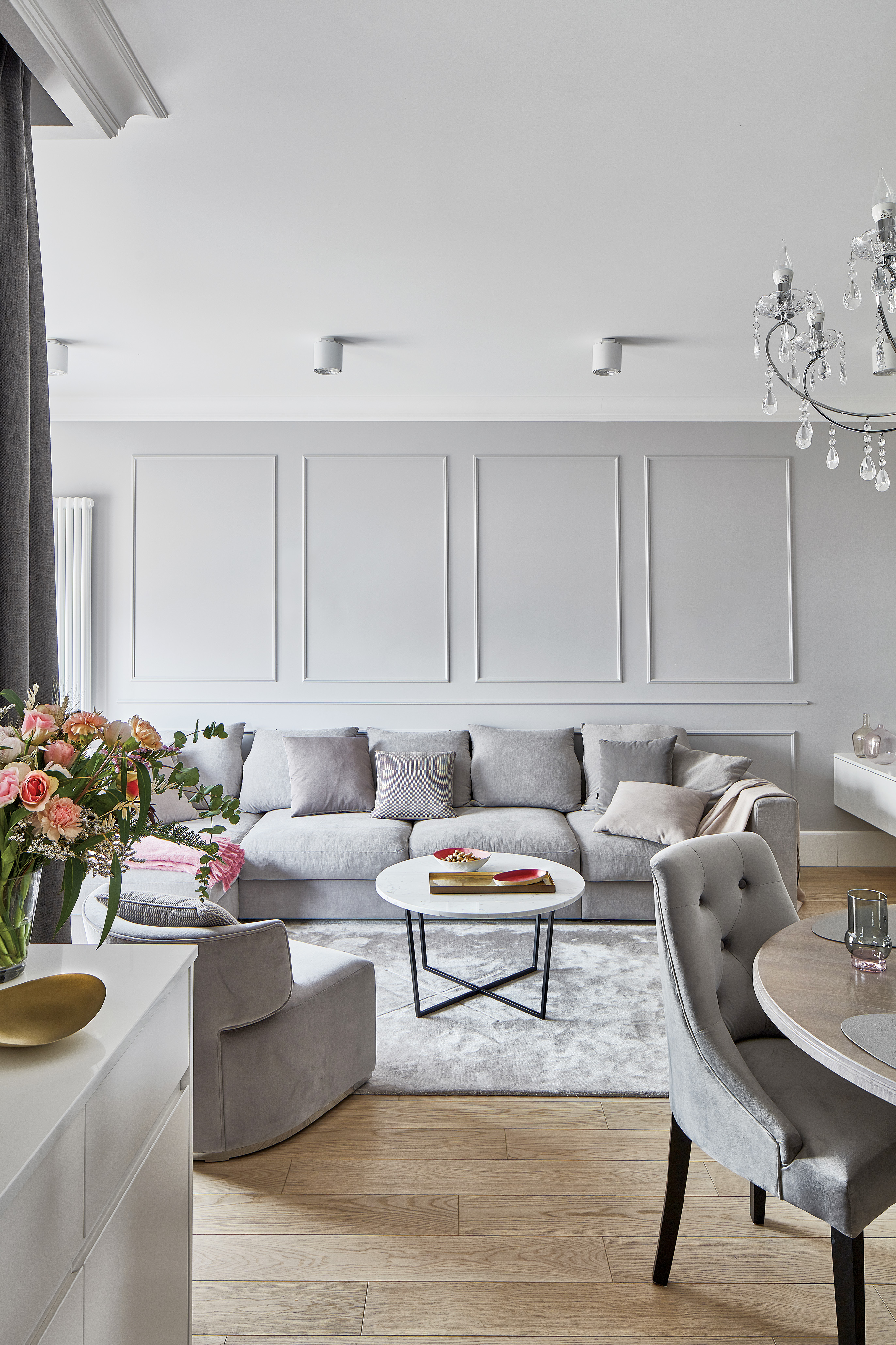 Nowoczesność i klasyka w apartamencie przy Polach Mokotowskich – szarość przełamana bielą