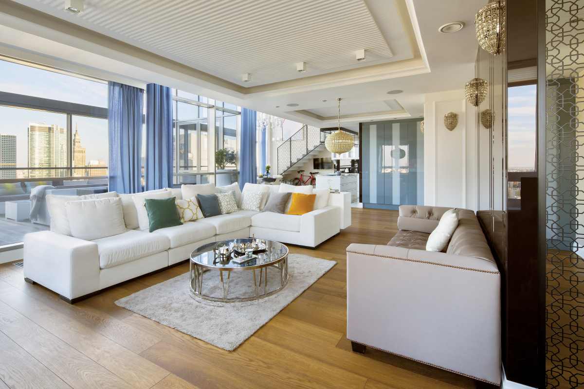 Widok za oknem zobowiązuje. Apartament został więc urządzony tak, żeby nic ich nie zasłaniało. Nawet w kąpieli można podziwiać warszawski świt.