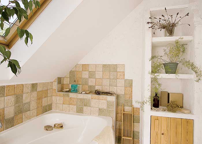 W tej rustykalnej łazience płytki są tylko tam, gdzie to konieczne.