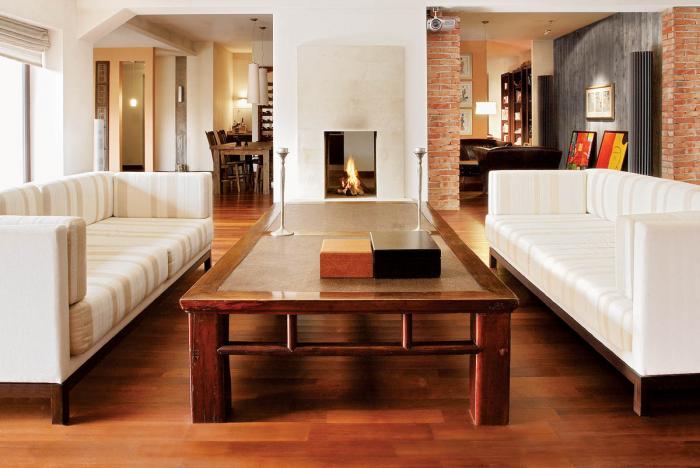 Dobre towarzystwo: betonowe ściany, kominek z piaskowca, podłoga z merbau. Wnęka na drewno przypomina dzieło