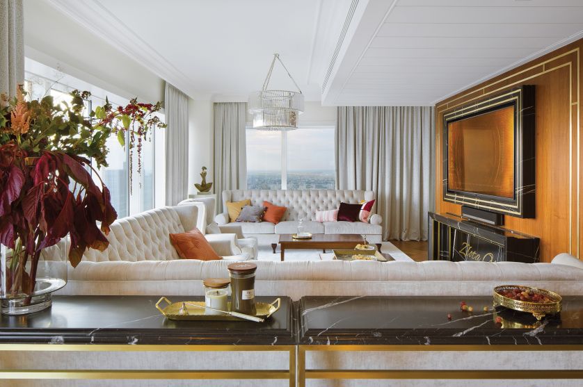 Najbardziej pożądany adres w Warszawie – Złota 44. Z okien apartamentu stolicę widać jak na dłoni. Dwustumetrowe, luksusowe wnętrza urządzono marmurami, drewnem orzechowym i artdecowskimi dekoracjami.