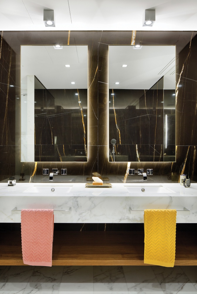 Czarne i białe marmury są w całym domu. Chłodne ledowe podświetlenia wydobywają szlachetny rysunek kamienia.