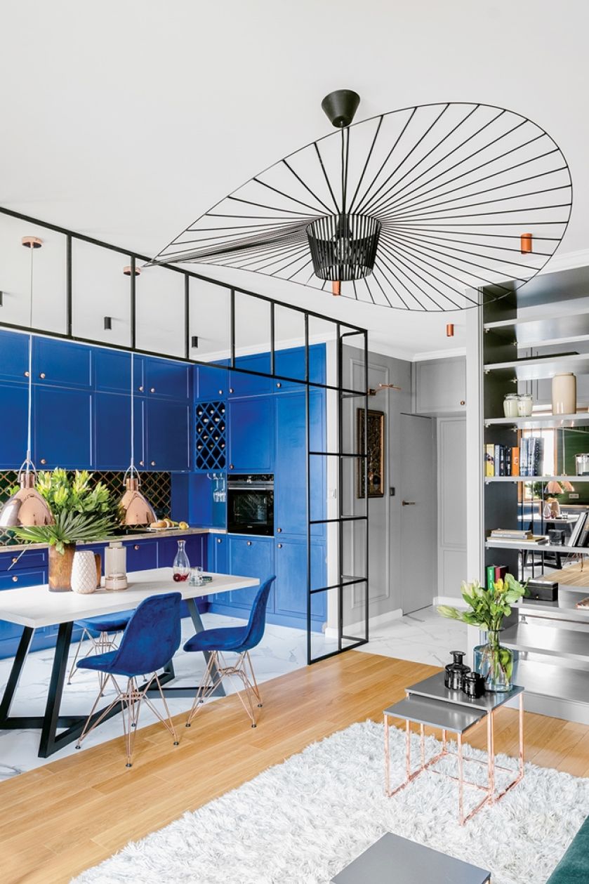 Ostry błękit w kuchni, butelkowa zieleń w salonie i pudrowy róż w sypialni. Wszystko spina miedź połyskująca ciepło w całym mieszkaniu. Oto odważne, lekko szalone mieszkanie Martyny.