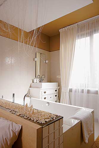 Kąpielowa część sypialni jest bardzo kobieca. Delikatny ornament na glazurze, niczym ze starej tapety, czarodziejska