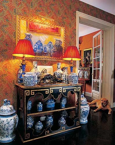 Zbior chińskich waz bielą i błękitem przełamuje cieple kolory apartamentu.