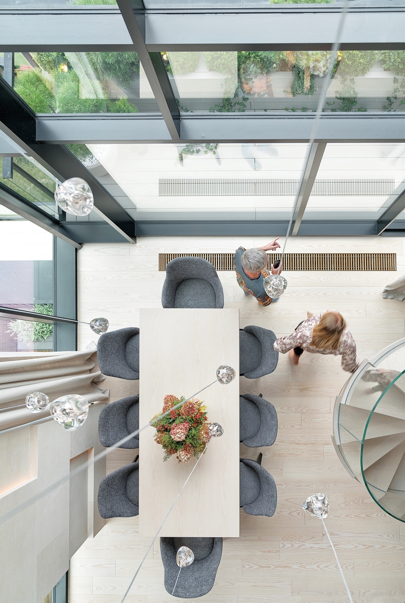 Jak w teatrze – szklane ściany i wiszące schody w nowoczesnym wnętrzu