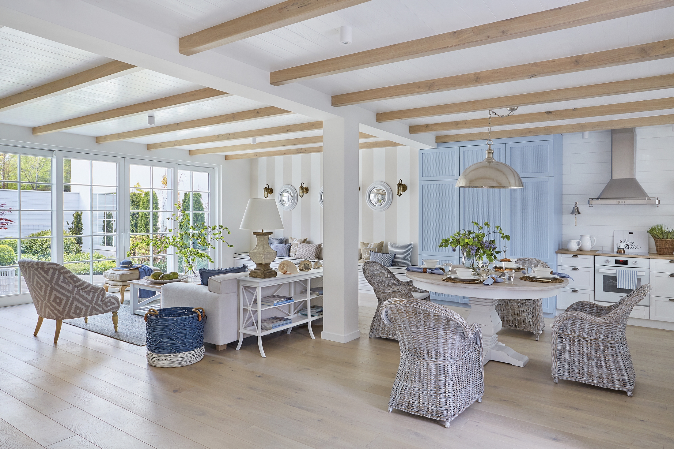 Błękit, biele i odcienie piasku, naturalne tkaniny – jedwabie i len, dużo drewna, kojarzące się z morzem i ze stylem hamptons dekoracje tworzą wakacyjny klimat tego wnętrza.
