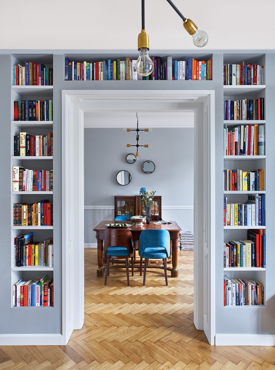 • łuki na ścianie w salonie jako nisze na dekoracje i książki