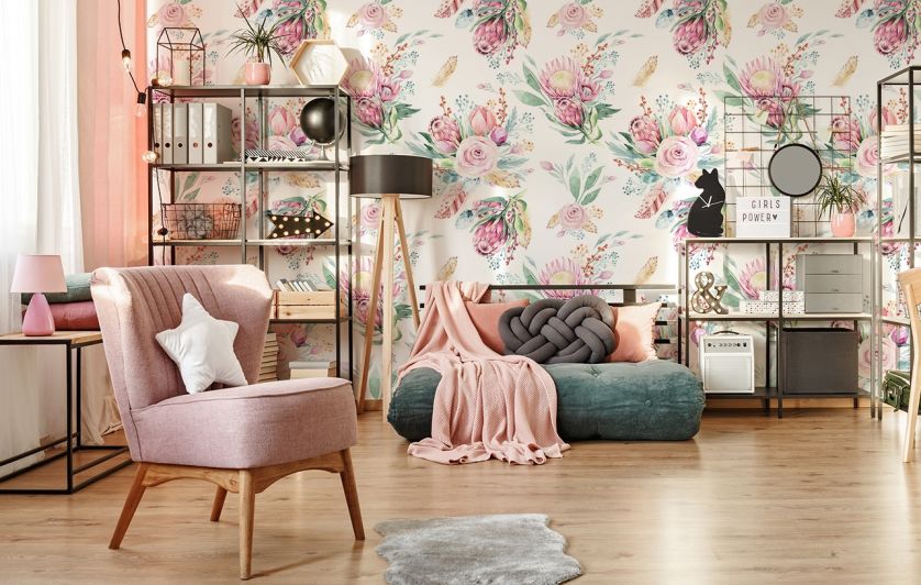 • różowa sypialnia z tapetą na ścianie