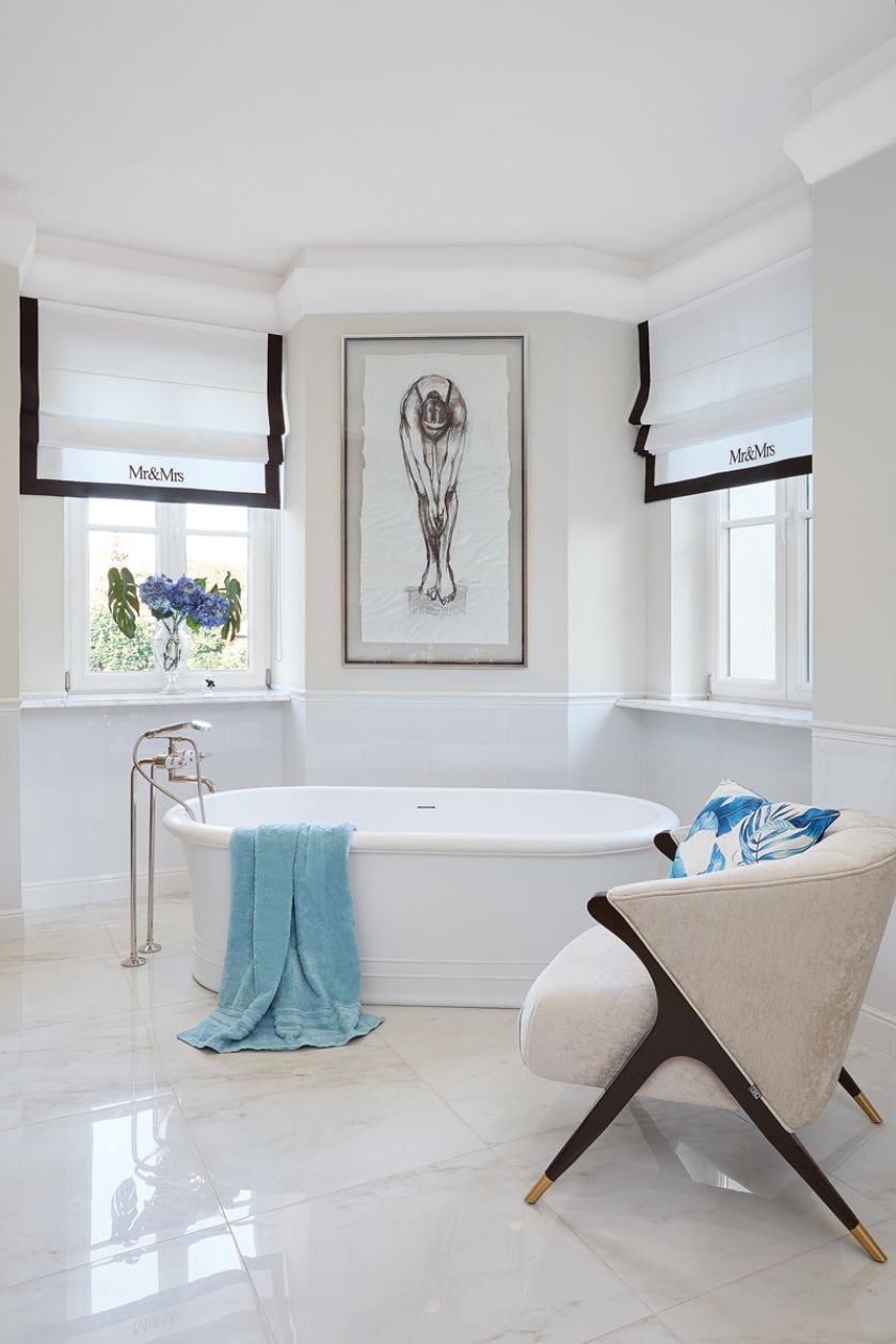 Jasne, lekkie i kobiece wnętrza urządzono w bieli, beżach i szarościach z niebieskimi i srebrnymi akcentami. Trochę w stylu klasycznym, trochę w stylu hamptons.